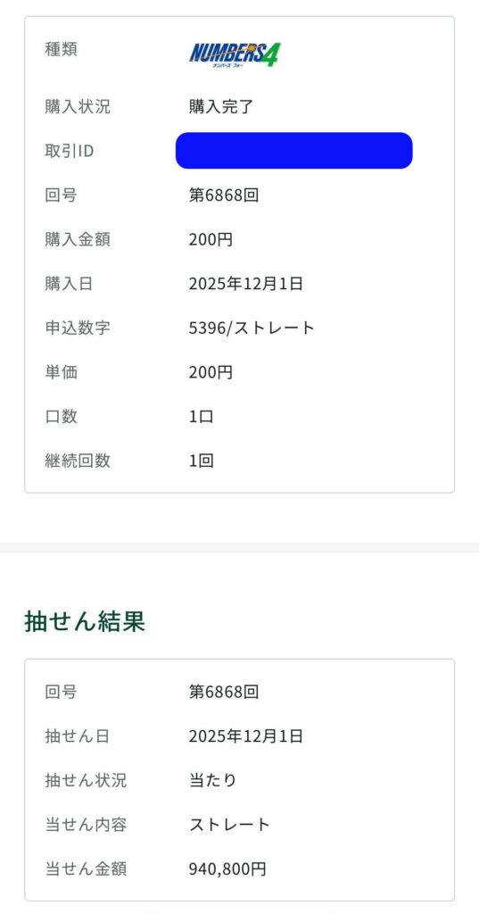 ミリオンドリームはナンバーズ4ストレートは940,800円の当選!