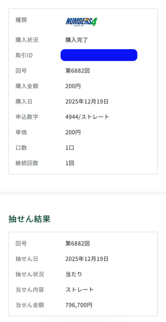 ミリオンドリームはナンバーズ4ストレートは796,700円の当選👍️