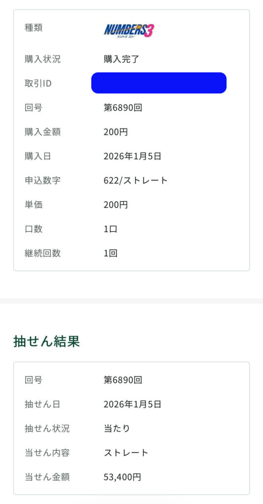 ナンバーズ4ストレートで1,042,200円の当選👍️