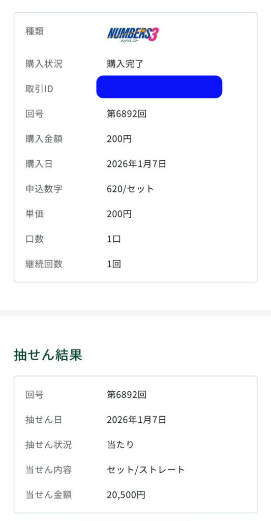 福袋セットではナンバーズ3セットストレート 20,500円、ナンバーズ3セットボックス 2,900円の当選👍️