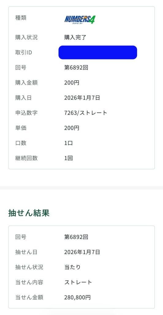 ナンバーズ4ストレートで280,800円の当選👍️