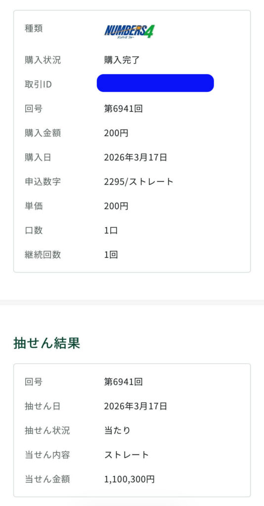 ナンバーズ4ストレート予想は1,100,300円の当選👍️
