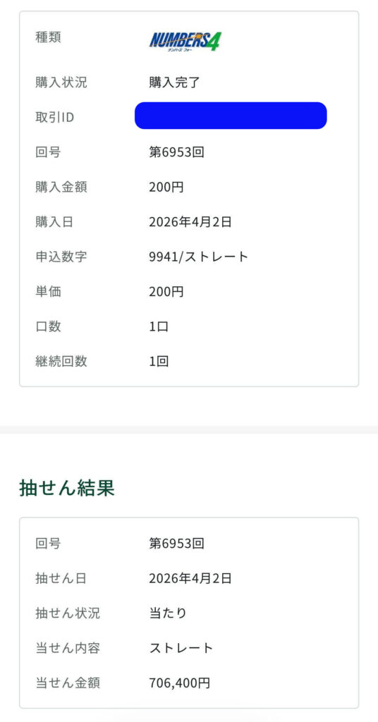 ナンバーズ4ストレート予想は706,400円の当選☝️