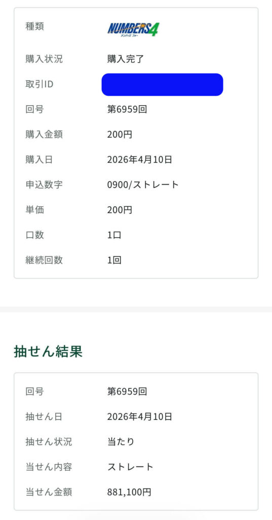 ナンバーズ4ストレート予想は881,100円の当選☝️